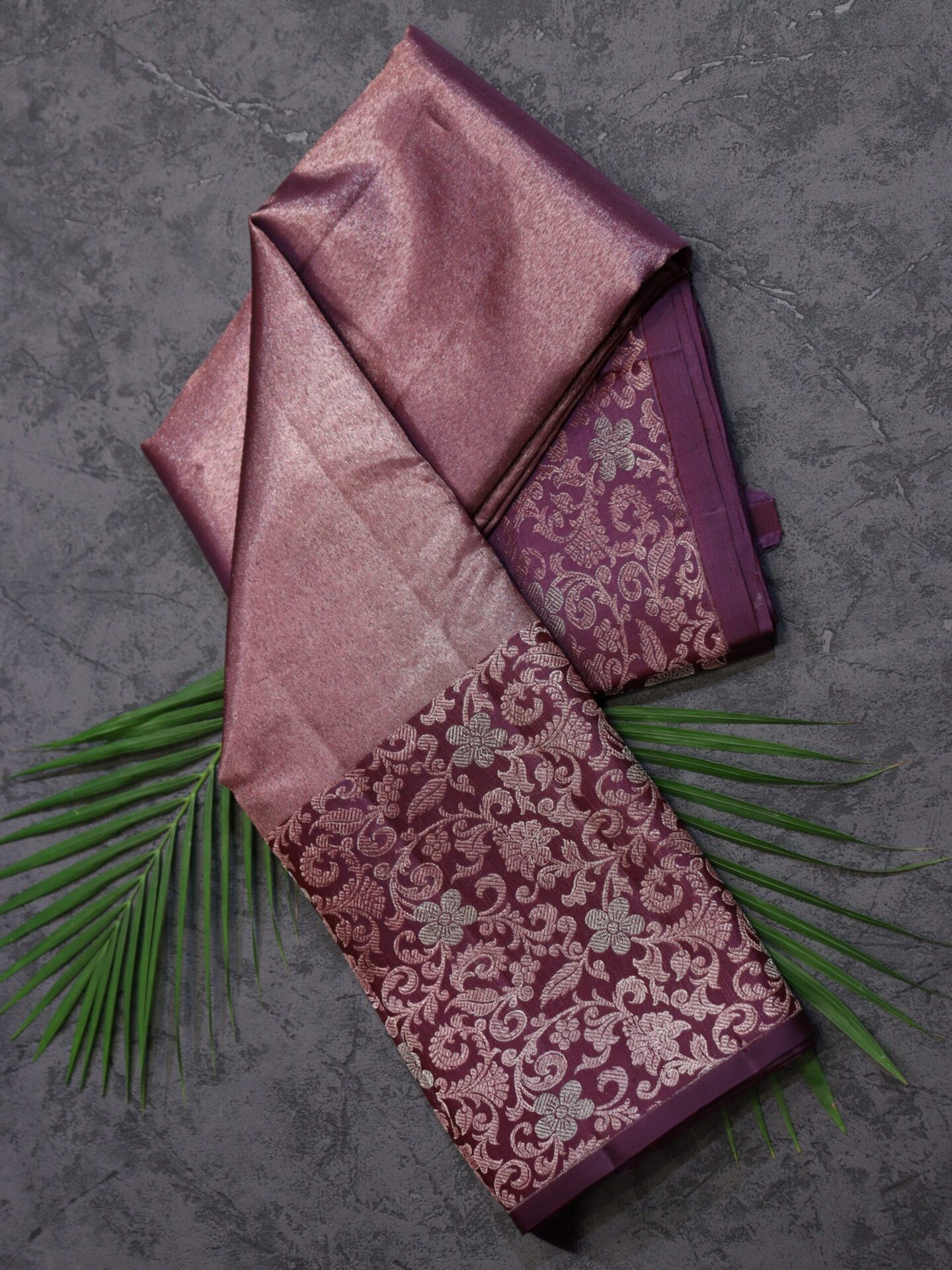The Copper Gold with Dark Lilac Tone Tissue Kanjivaram Saree exudes elegance and sophistication. The saree features a stunning combination of copper gold and dark lilac tones, creating a rich and luxurious look.