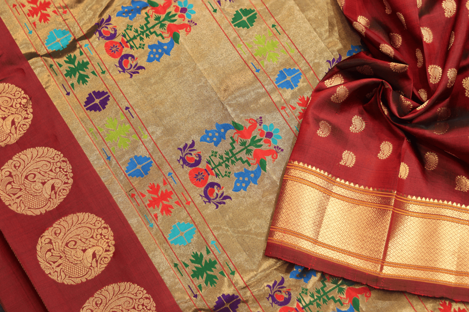 Maroon kalanjali paithani Golden paisley motif on saree