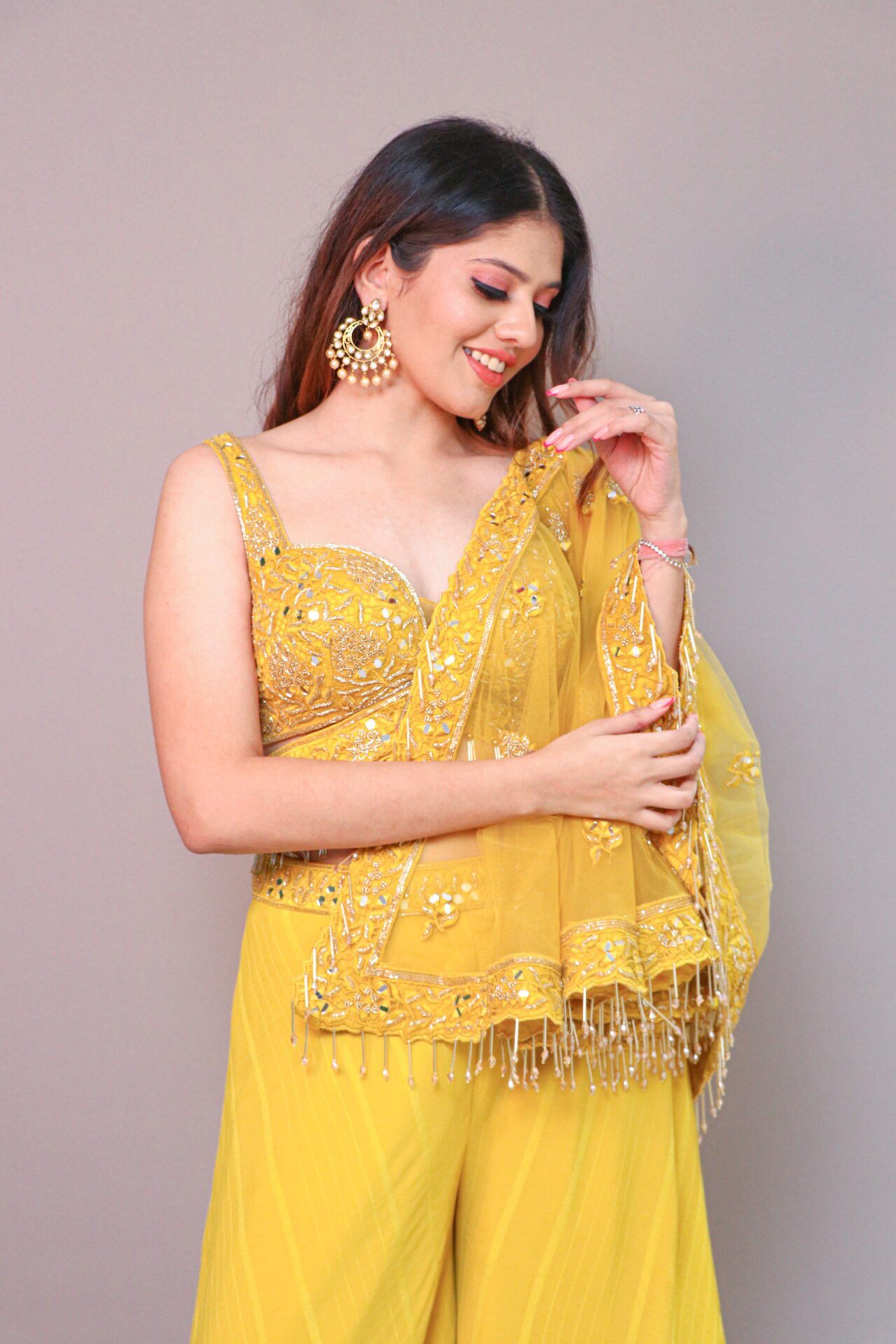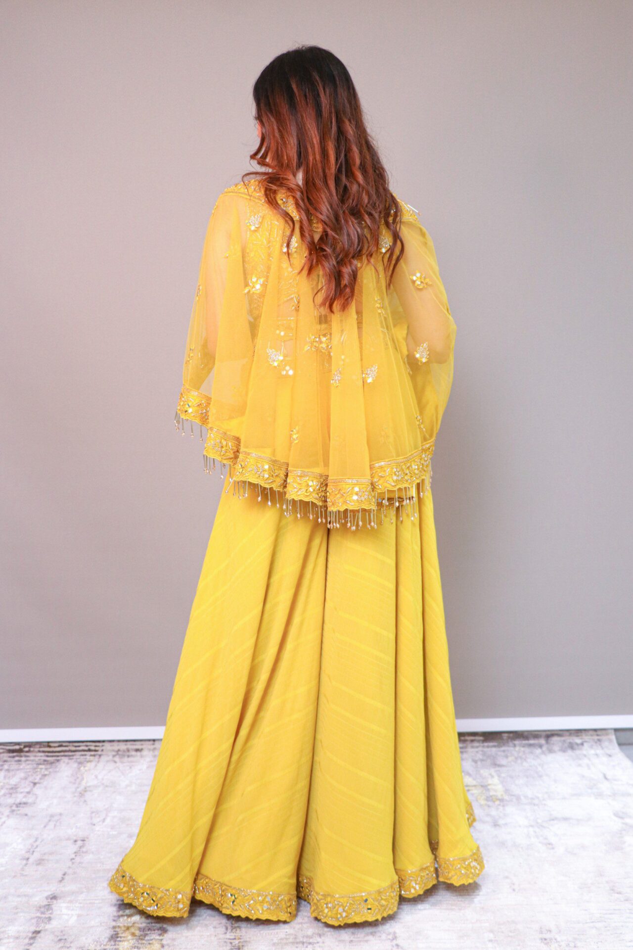 Mustard yellow 3 piece set crop top, palazzo and poncho jacket. The crop top is a short, typically sleeveless, top that ends above the waist or at the midriff.Palazzo pants are wide-legged trousers that are loose and flowy, providing a comfortable yet stylish option for the lower half of the outfit.It’s a versatile ensemble that can be worn for various occasions.