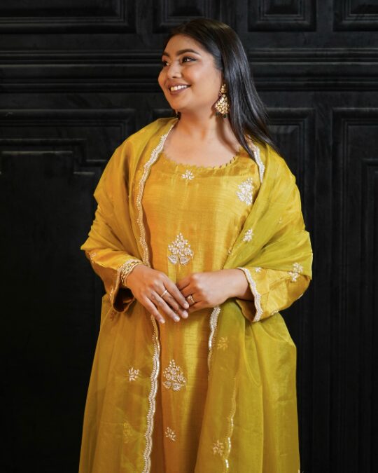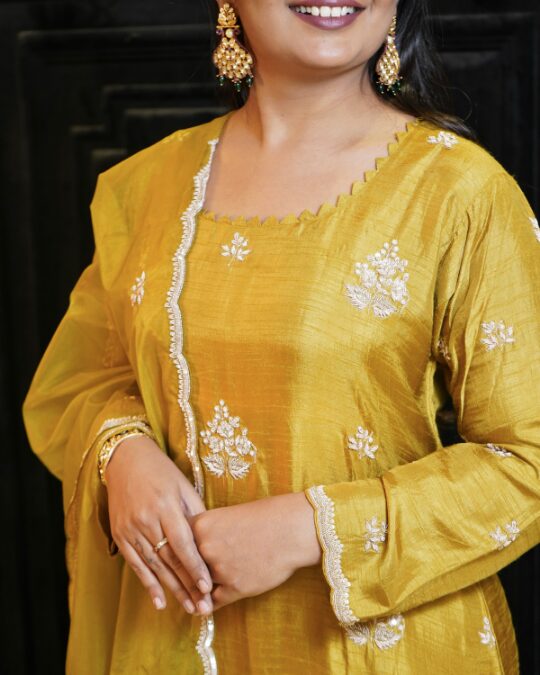 Kurta with buttis all over it and self pants , dupatta with buttis and scallop border