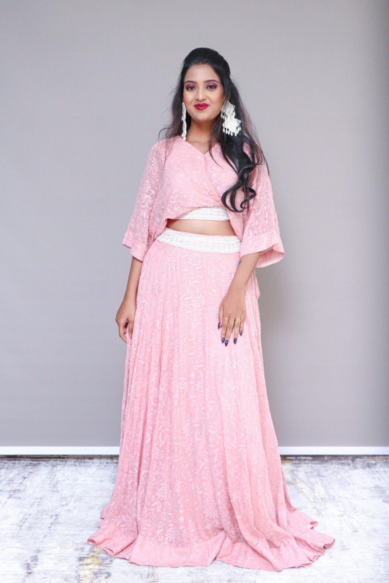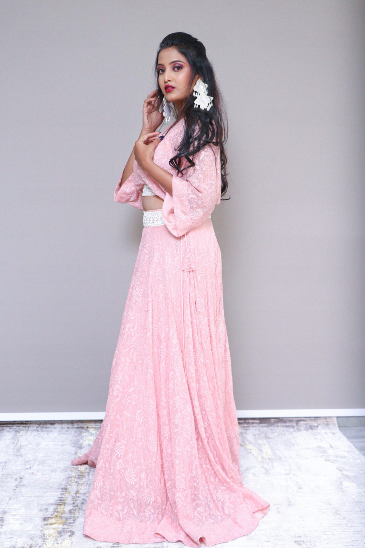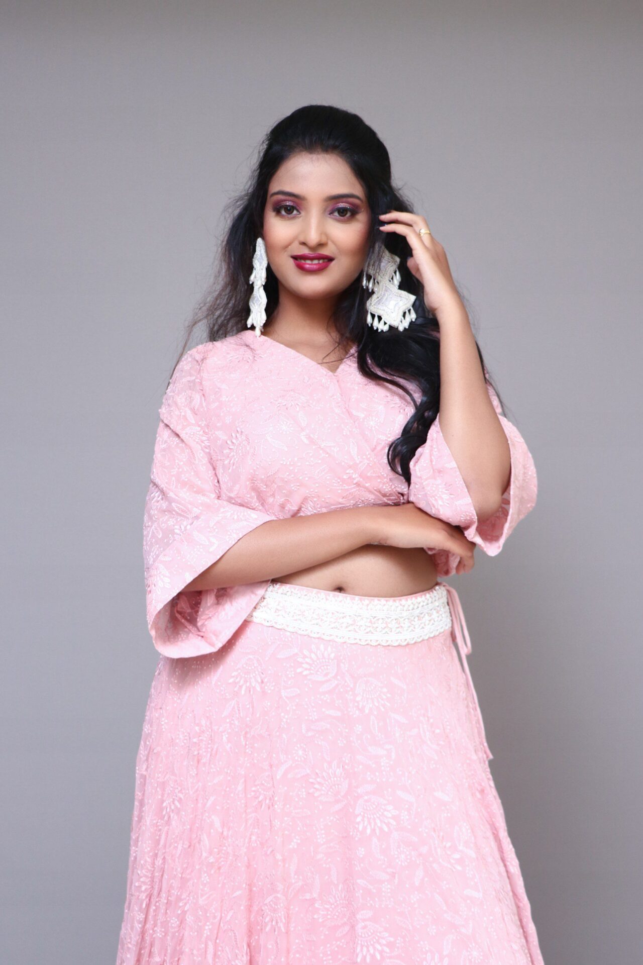 A pink crop top and skirt set is a stylish and coordinated outfit that typically features a matching crop top and skirt, both in shades of pink.It offers a coordinated and fashionable appearance while allowing you to mix and match with accessories and footwear to create your desired look.