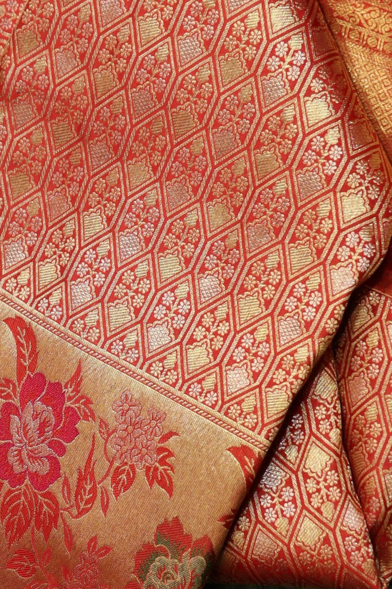 The saree is adorned with intricate hexagonal brocades woven in a fusion of rose gold and gold, creating a stunning visual effect that mesmerizes the beholder. These hexagonal motifs add a touch of geometric allure to the saree, elevating its elegance to new heights.