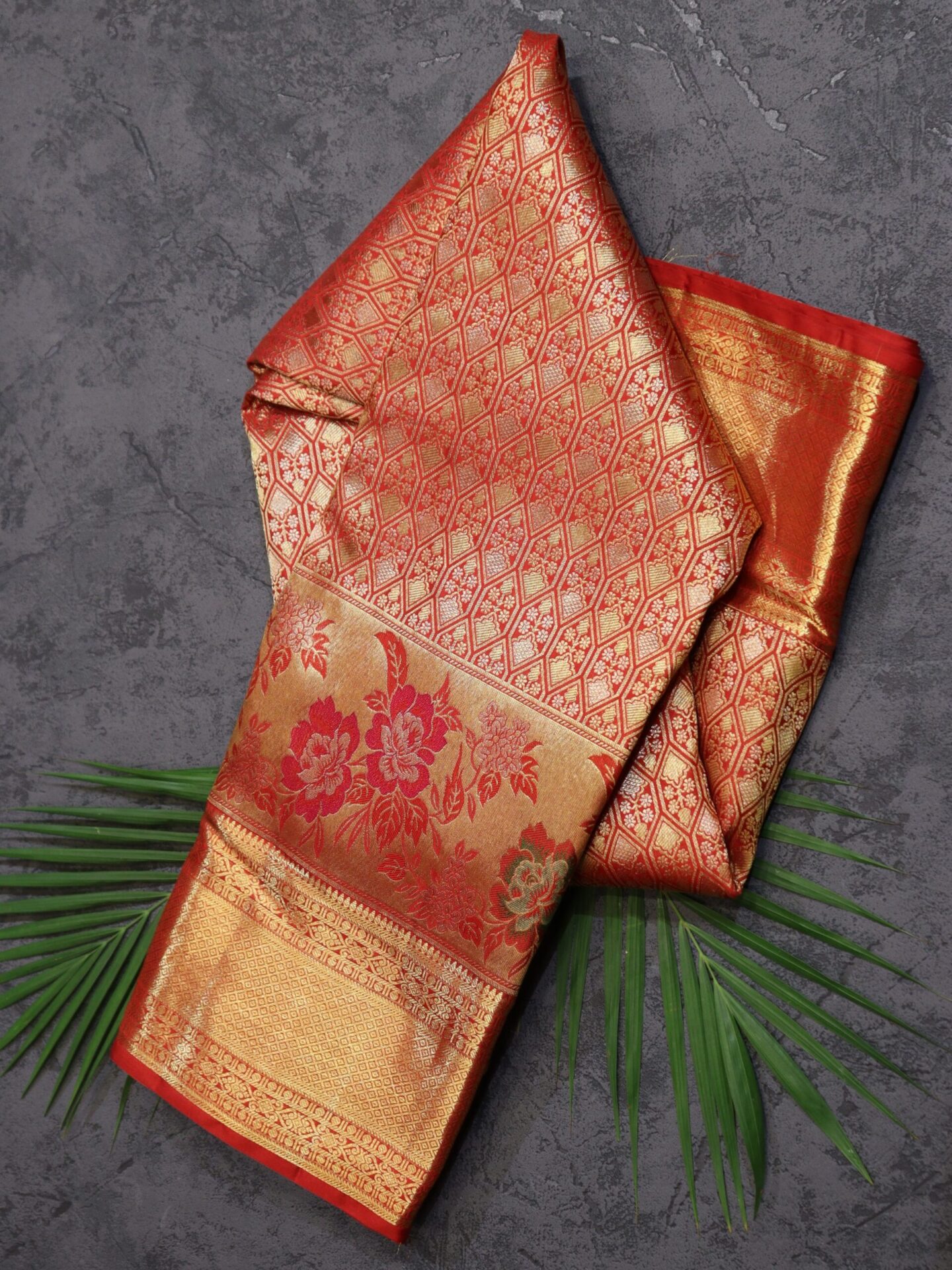 Pair this exquisite saree with traditional gold jewelry to complement its richness, or opt for rose gold accents for a modern twist. Complete the look with a sleek hairstyle and minimal makeup to let the saree shine.