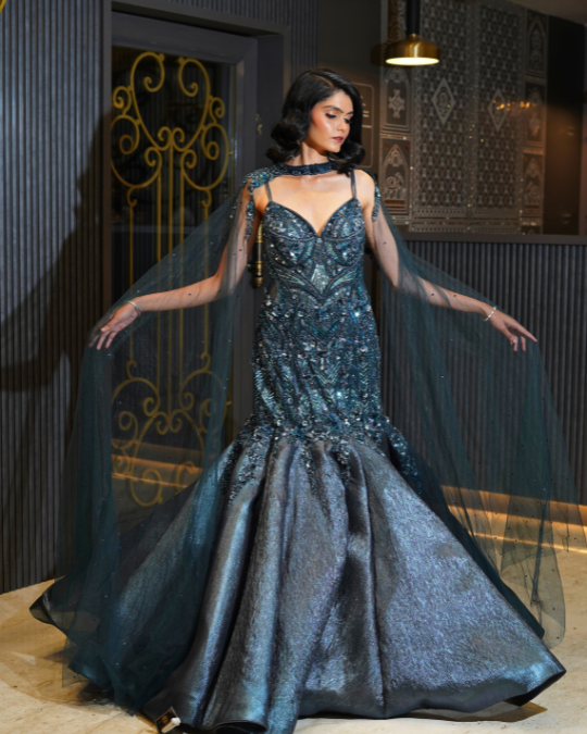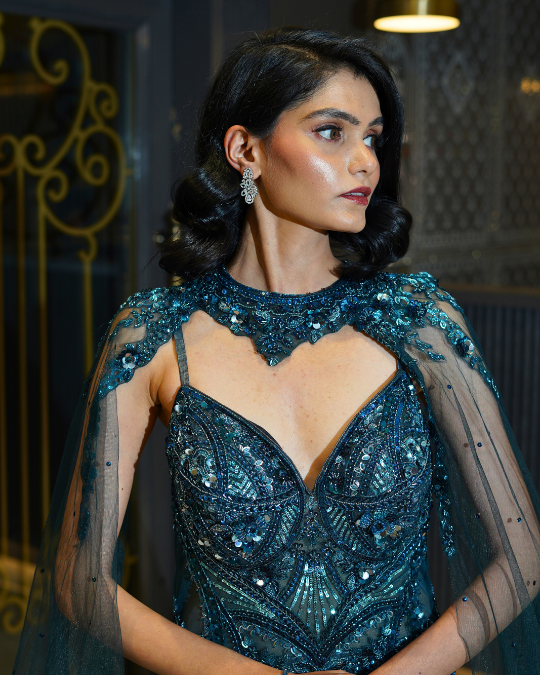 Make a breathtaking statement in this exquisite teal blue fishcut bridal gown, designed for the modern bride who loves timeless glamour with a touch of artistry. The elegant V-neckline beautifully frames the décolletage, while the dramatic elephant sleeves with neck patch add a regal, couture-inspired silhouette. Intricately adorned with hand-embroidered sequins and cutdana work, the gown shimmers with every movement, showcasing meticulous craftsmanship and refined detailing. The figure-hugging fishcut silhouette flows effortlessly into a stunning textured shimmer fabric flare, creating a graceful and luminous finish that elevates the overall look.